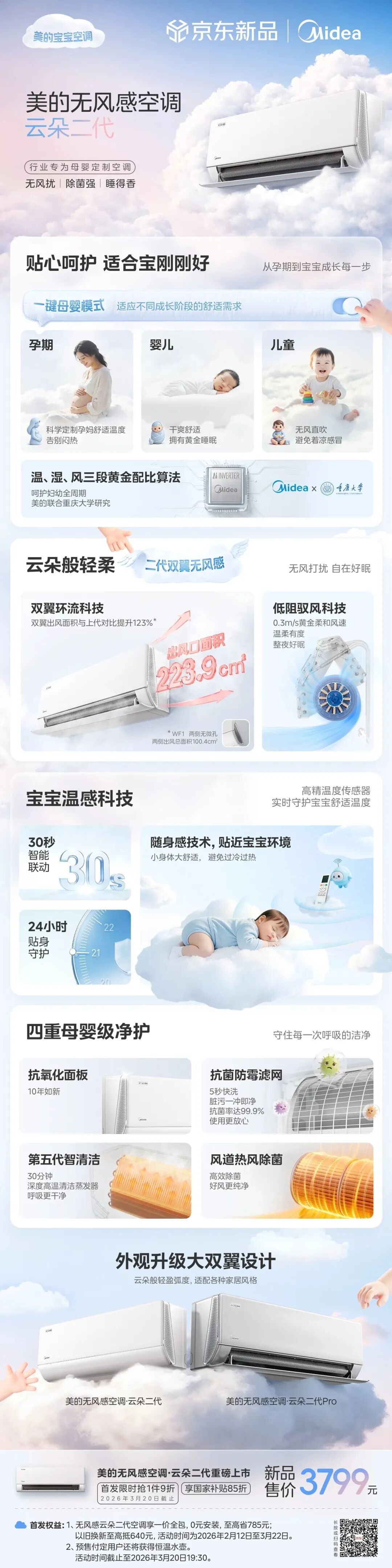 为了实现这份“刚刚好”,硬件的革新也至关重要。美的无风感宝宝空调搭载了第二代双翼无风感科技,主风口上密布的1762个微孔将强劲的气流打散、柔化,最终输出风速仅为0.3m/s的“零感柔风”,那是人体几乎无法察觉的流动。与此同时,侧翼双风口面积升级至223.9cm²,相比第一代提升了123%,更大的出风面积带来了立体环抱式的风感体验,让凉意不再是突兀地砸向人体,而是均匀、快速地弥漫在整个空间。没有风的打扰,才有梦的美好 。