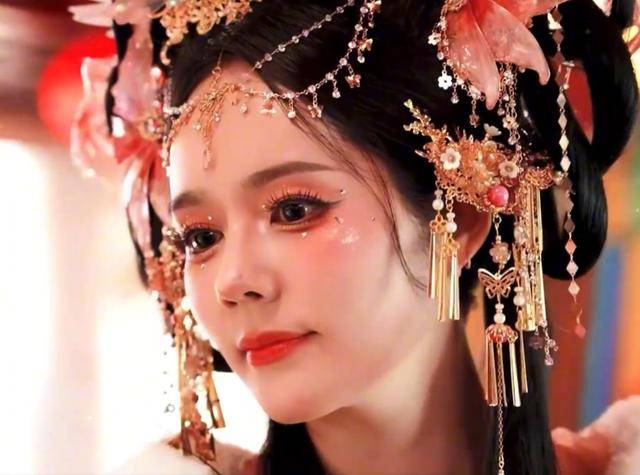 化妆师给她化了当下流行的网红妆,厚重的粉底遮住了原本的肌肤质感,夸张的假睫毛和红色眼影,显得十分浮夸。